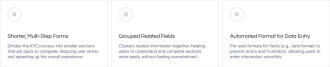 The improved KYC design addresses key pain points with clear, manageable steps, explanations for sensitive data requests, and automated formatting to reduce errors.