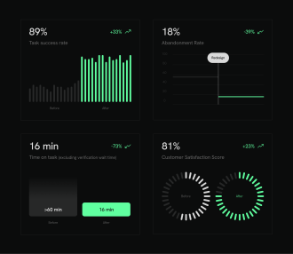 With a comprehensive UX audit, targeted redesign, and two rounds of usability testing, we achieved remarkable results—boosting the KYC flow’s task success rate by 33% and cutting the abandonment rate by an impressive 39%.