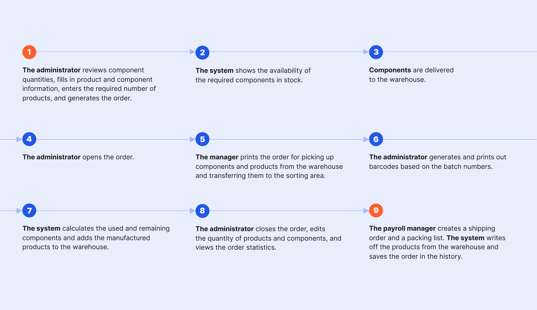 Production orders. A person in charge views the order history and statistics, registers, adds, closes, and deletes new orders.