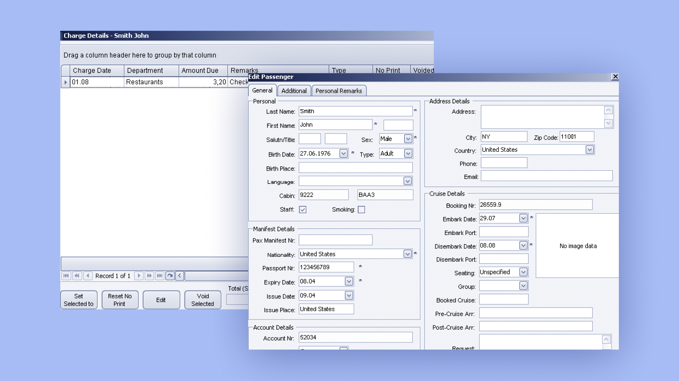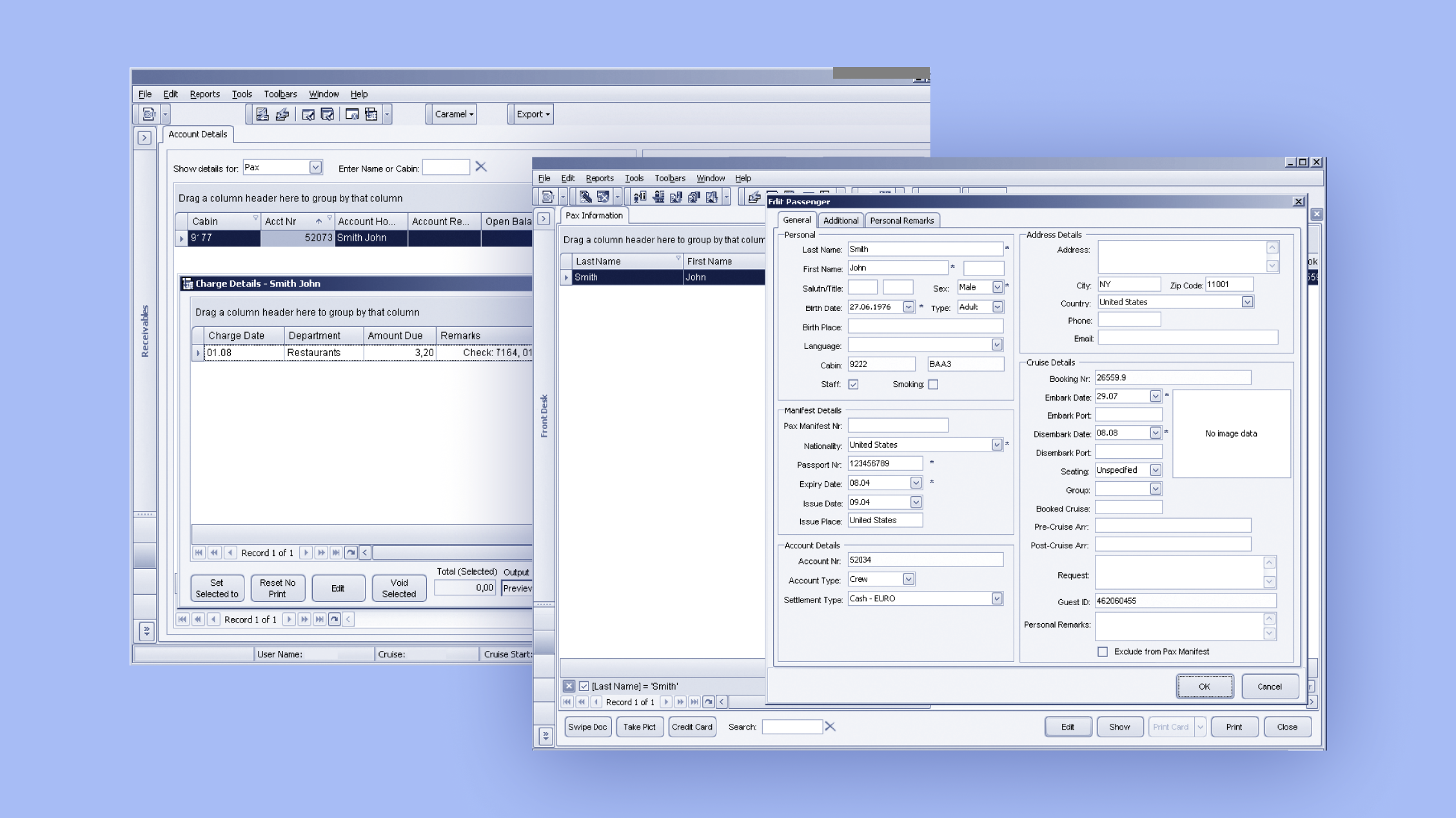 This module is designed to store information about passengers (passport details, birth date, nationality, address, etc.), cruise details and other data necessary for the voyage. It is also possible to add supplemental information about passengers, including their preferences, medical conditions, and more.